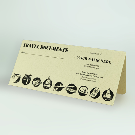 DESIGNED TO SUIT YOUR NEEDS….Just about every method of transportation appears in the travel icons across the bottom of this document holder. The handy Travel Checklist on the pocket provides added value. You can even add an Itinerary Form or a Services Panel to the flap!Ships in just 7 business days!Options include: • Your choice of paper and ink • Add a form to the flap-choose from a standard Itinerary or a customizable Services Panel • Add your own custom logoFolder Size: 10-1/4” x 4-1/2” closed